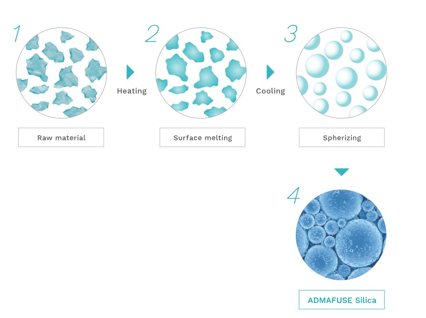 雅都瑪的ADMAFUSE是平均粒徑為5至30μm的球形無定形二氧化硅產品,采用熔融法生產。在熔融法中,破碎的二氧化硅晶體被裝入熔化爐中,以允許通過表面張力形成球體。