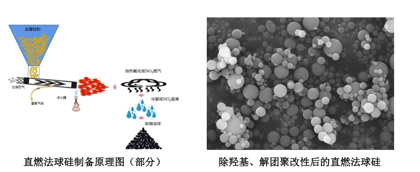直燃法:錦藝新材BQ系列球硅產品為單質硅經燃燒、氣化凝結而成,再經提純、超細分級、表面處理等工藝制造而成。公司與供應商合作研發,依托該相關原理制得相關球硅原粉,并且通過燃燒器和冷凝器的特殊設計,有效解決球化過程中空心球較多的問題。此后,針對原粉存在大球,以及粉體表面羥基較多的問題,公司通過自主研發的除大球和除羥基技術,去除過大的粉體,并有效降低粉體表面羥基含量。另外,由于直燃法球硅粒徑屬于亞微米級別,粉體易團聚并影響表面改性效果,公司針對性開發納米物理隔離改性技術,能夠有效避免粉體團聚。
