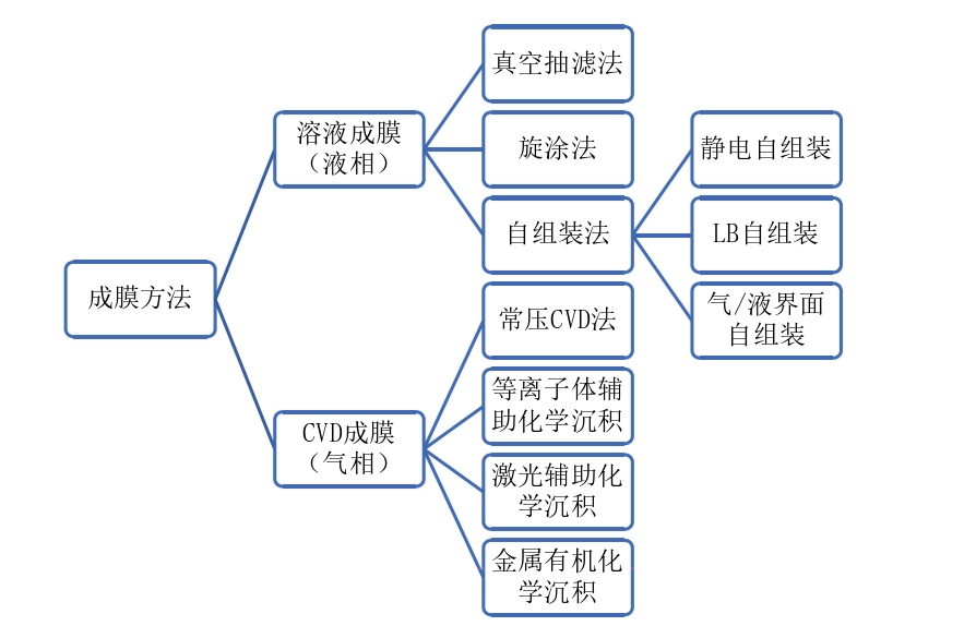 石墨烯薄膜的制備方法按石墨烯初始物態可分為溶液成膜和化學氣相沉積法 (CVD)成膜兩大類。其中,溶液成膜類的方法有真空抽濾法、旋涂法以及自組裝法等,CVD成膜類的方法有常壓CVD法、等離子體輔助化學沉積法、激光輔助化學沉積法以及金屬有機化學沉積法等。