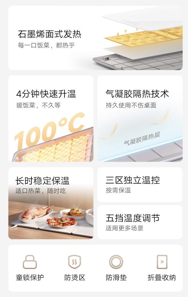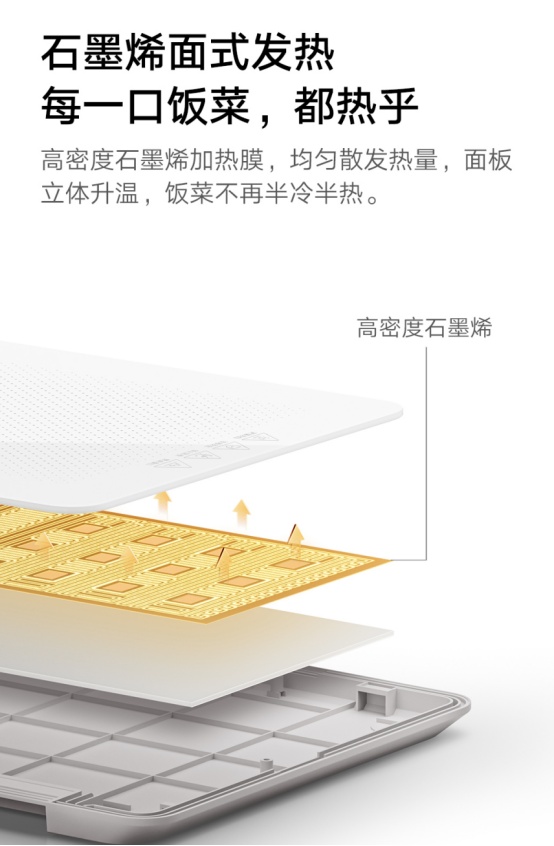 米家折疊暖菜板采用高密度石墨烯膜覆蓋加熱區,發熱面積更大,熱量傳遞效率更好,分布更均勻,石墨烯材料具有高度的穩定性,即使長時間處于高溫狀態,也不易發生氧化等反應,更有助于飯菜的長久保溫。