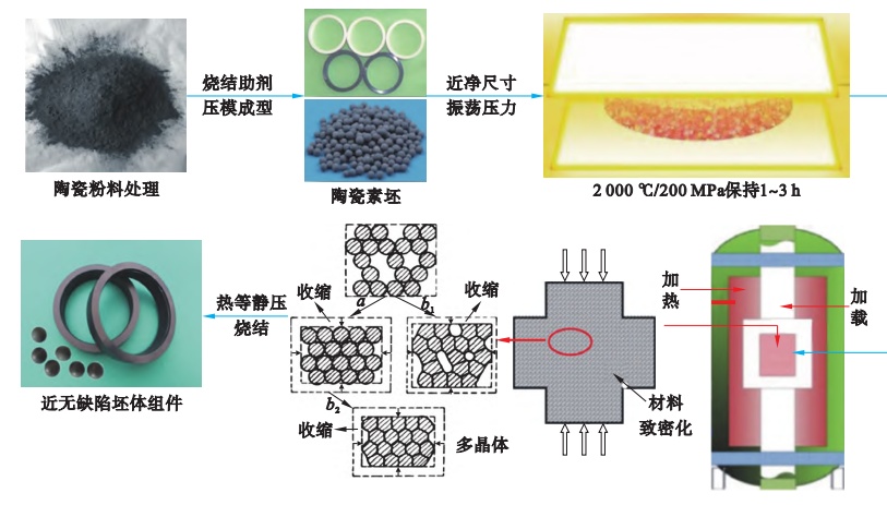 熱等靜壓燒結是一種燒結工程陶瓷快速致密化的最有效方法。該方法以氣體作為壓力介質,燒結過程中在產品的各個方向上施加同等壓力,在高溫、高壓作用下實現產品致密化。相比于其他燒結方式,熱等靜壓燒結制品具有更理想的壓碎載荷比、離散度和截面孔隙度,進而獲得更好的軸承組件硬度和斷裂韌性。目前,美國ORTECH、加拿大CYCLONE、日本UBE等公司生產的氮化硅陶瓷球均采用熱等靜壓燒結方式。而國內廠商受限于燒結過程中用于隔絕高溫/高壓氣體的包套的相關制備技術不成熟,無法實現粉體在惡劣環境中的直接熱等靜壓燒結成型,因而多采用氣壓燒結預成型后,再經熱等靜壓二次燒結處理,該種燒結方式制得的陶瓷軸承組件與直接熱等靜壓成型相比,其硬度和斷裂韌性等屬性均有所下降。