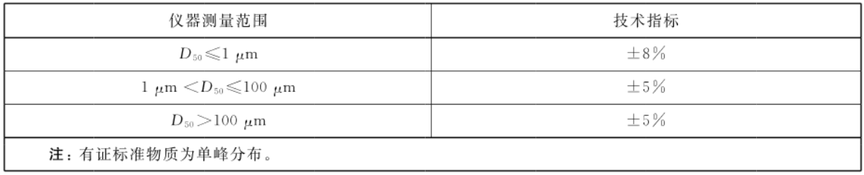 對(duì)有證標(biāo)準(zhǔn)物質(zhì)的D50重復(fù)測(cè)量3次,儀器測(cè)量平均值與粒度標(biāo)準(zhǔn)物質(zhì)的標(biāo)準(zhǔn)值間的相對(duì)誤差應(yīng)符合以下表中的技術(shù)指標(biāo)。