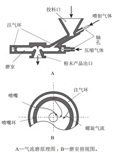 氣流磨亦稱流能磨,核心部件為噴嘴及粉碎腔;工作原理是以高速氣流或過熱蒸汽為沖擊載體,將其從噴嘴噴出,為物料的斷裂行為提供能量,導致物料裂紋失穩并在外力作用下張開而擴展,宏觀表現為物料粒徑的變化。以高速氣流為沖擊載體的氣流磨常用于中藥粉碎處理,可分為以下5種:水平圓盤式、循環管式、對噴式、撞擊板靶式、流化床式。