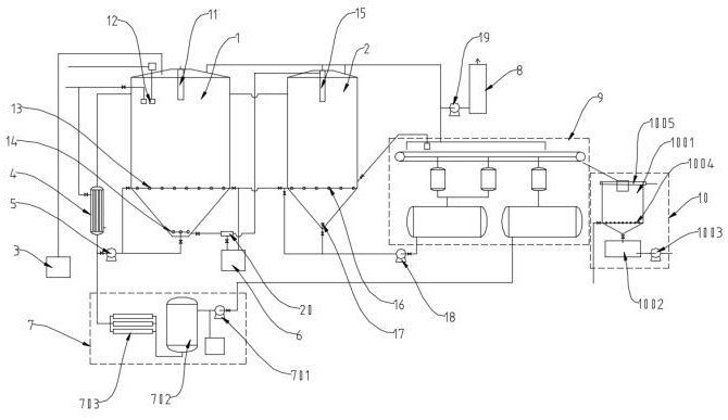 該發(fā)明公開了一種連續(xù)流水線式大規(guī)模酸洗生產低鐵石英砂裝置,包括串聯(lián)或并聯(lián)設置的流化床A床、流化床B床,以及加藥裝置、加熱器、酸泵一、空壓機、酸凈化系統(tǒng)、尾氣處理系統(tǒng)、連續(xù)排砂系統(tǒng)以及廢水處理系統(tǒng),以及中控系統(tǒng);該發(fā)明解決了大規(guī)模提純生產石英砂,大型酸洗流化床應用中易堵、有死角、反應時間長難題;該發(fā)明采用動態(tài)酸砂分離技術,解決了連續(xù)生產需連續(xù)排砂難題;該發(fā)明采用流化床型水洗中和裝置,實現(xiàn)了水洗連續(xù)化目標;該發(fā)明中酸凈化技術,解決了循環(huán)用酸永不外排目標;該發(fā)明中水凈化技術,解決了循環(huán)用水永不外排目標。