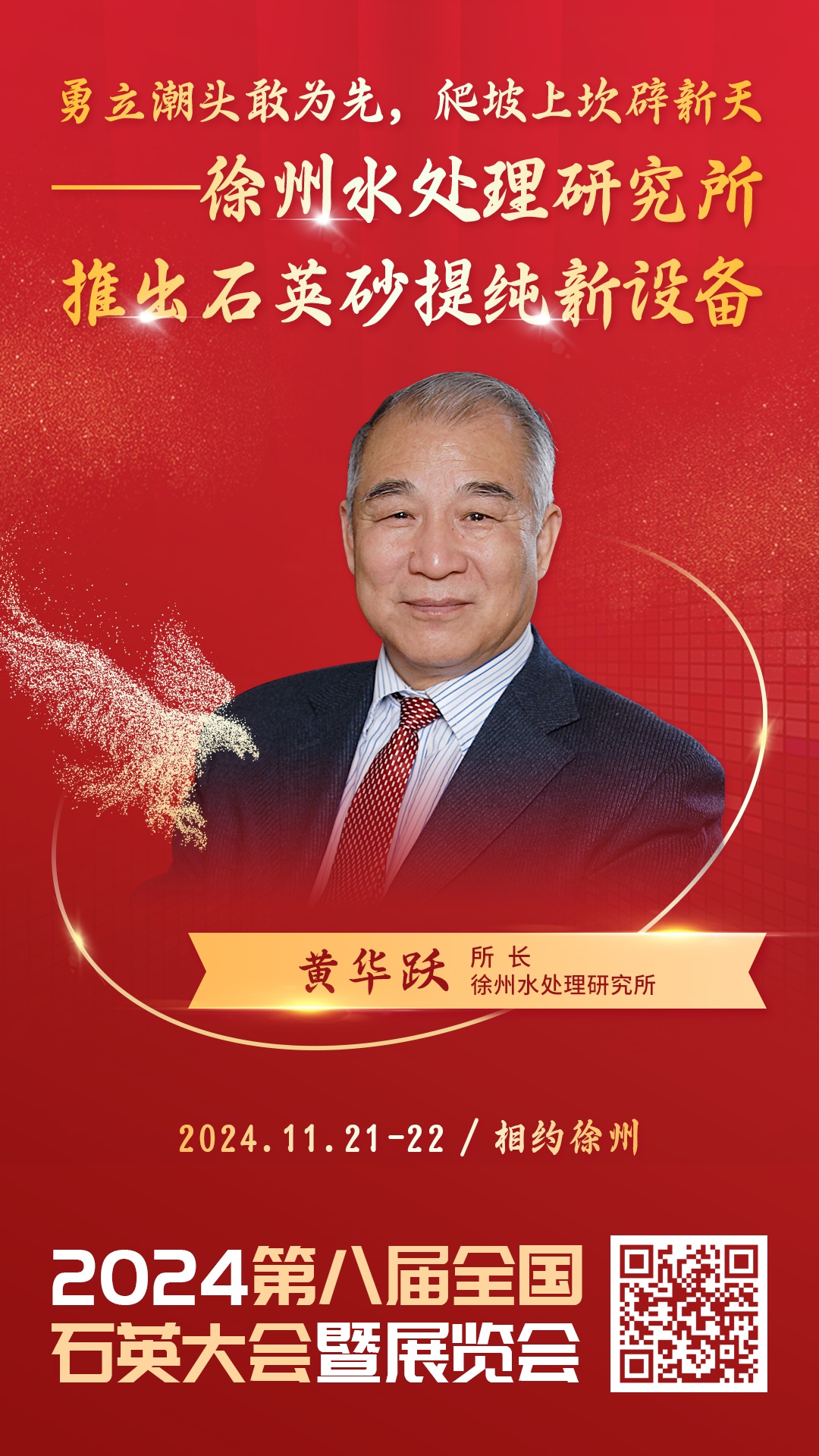 2024年11月21-22日,由中國粉體網(wǎng)主辦的“2024(第八屆)全國石英大會暨展覽會”將在江蘇徐州召開,徐州水處理研究所所長黃華躍將做《勇立潮頭敢為先,爬坡上坎辟新天——徐州水處理研究所推出石英砂提純新設備》的報告,屆時,他將結合公司產品應用案例,詳細解讀石英砂提純新設備。