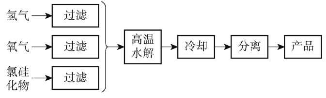 氣相合成法即火焰水解法,與氣相白炭黑工藝類似,其原理是采用硅或有機硅的氯化物(如SiCl4或CH3SiCl3等)原料,將其氣化后與氫氣、氧氣混合,在高溫下發(fā)生水解形成霧狀的SiO2,最后通過冷卻、分離、脫酸等氣固分離得到產(chǎn)品。該法得到的產(chǎn)品為氣相SiO2,粒徑小于100nm,外觀蓬松多孔,比表面積大,化學(xué)純度高,分散性較好。