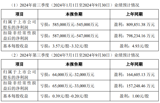 中國粉體網訊 10月24日,天齊鋰業發布2024年前三季度業績預告,預計2024年前三季度凈虧損54.5億元-58.5億元,上年同期盈利80.99億元。預計第三季度凈虧損3.2億元-6.4億元,上年同期盈利16.46億元。