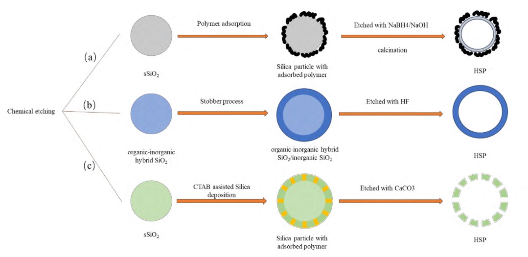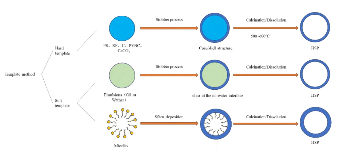中空二氧化硅球形顆粒(HSP)是一種特殊類型的新型無極材料,內部有一定的空腔。HSP模板法的制備過程中,通常是使用各種分散性較好的球形納米結構模板,在模板上通過物理或化學的方式將二氧化硅殼層包覆在模板上,再通過煅燒或者蝕刻將模板去除,得到最終產物。模板具有對材料尺寸和形狀的指導作用,這也是模板法合成HSP的一般優勢。