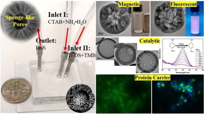 微流控法具有反應快速、產率高、易自動操作的優點。Hao等人使用雙運行螺旋形微流控反應器制備HSP,其中一個入口流含有CTAB和稀氨,另一個含有TMB和稀釋的TEOS,它們以相同流速進入螺旋微通道,并進行反應,最終在出口收集HSP。作者成功裝載了不同類型的功能納米顆粒,為生產各種應用前景的中空納米二氧化硅提供了新的思路。