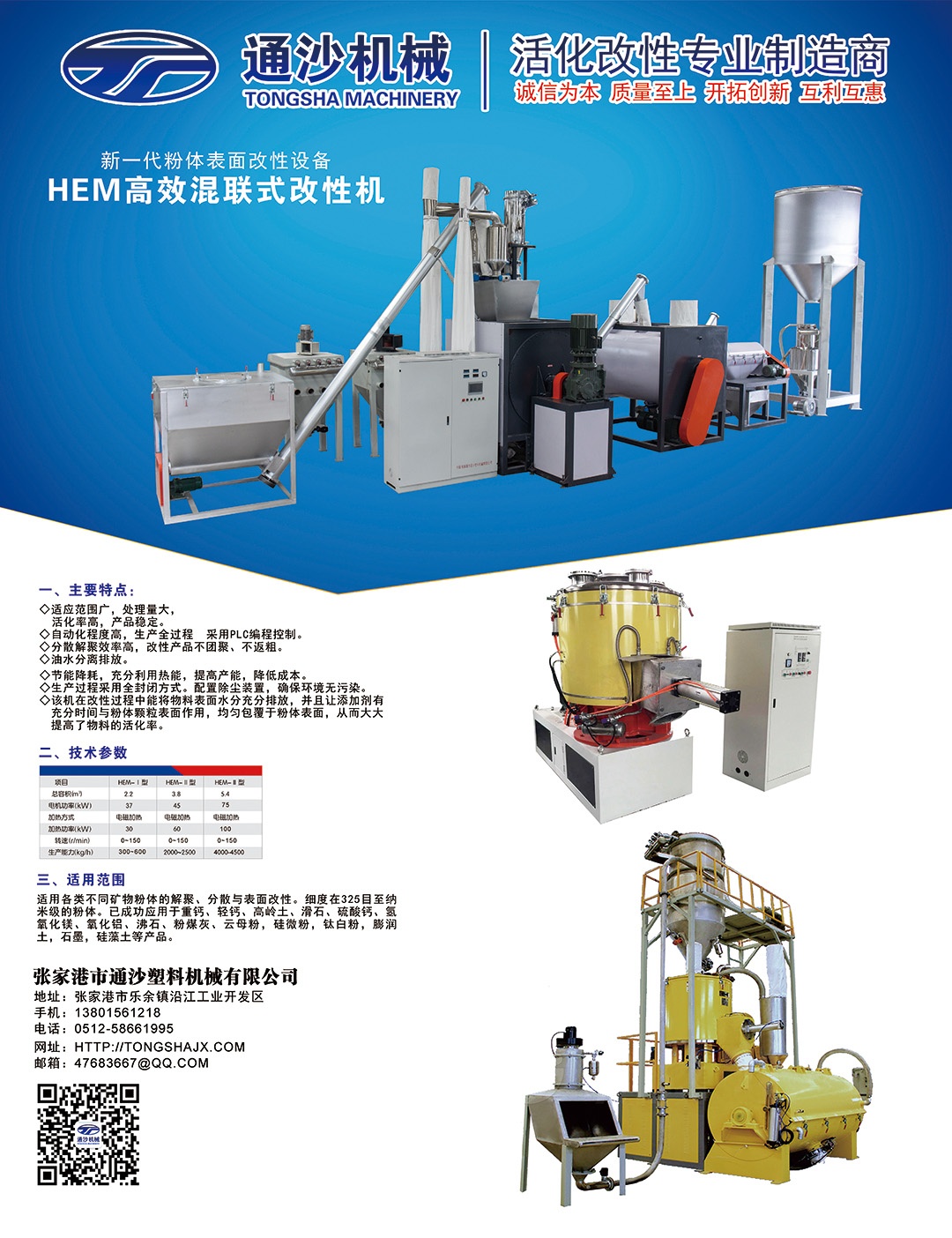 張家港市通沙塑料機(jī)械有限公司是國內(nèi)生產(chǎn)粉體改性機(jī)械的企業(yè)。公司與全國十多所專科院校聯(lián)合開發(fā)新型材料。公司是改性協(xié)會(huì)常務(wù)理事單位之一。從事非金屬礦粉體表面改性及相關(guān)深加工與工藝的研究。