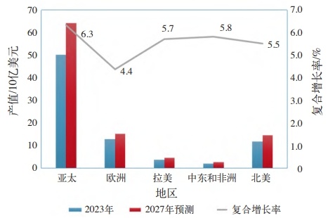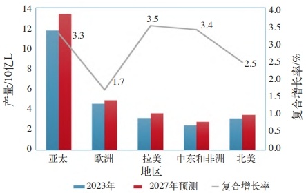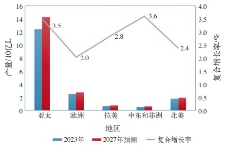 需求端看,2023年全球涂料需求約470億L,市場規(guī)模約1970億美元,預計到2027年將增長至530億L,復合年均增長率3.1%,市場規(guī)模約2470億美元,復合年均增長率5.8%;地域端看,市場主要集中在亞太地區(qū),同時,增速也遠高于其他區(qū)域。