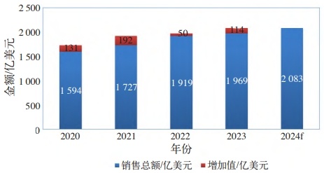 2020-2024年全球涂料銷售額增長及絕對值增長(預測)