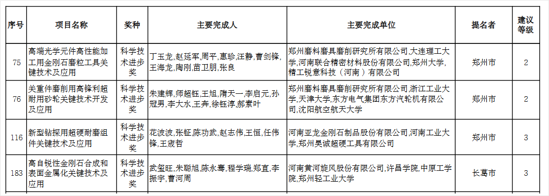 除此之外,還有兩項(xiàng)超硬材料項(xiàng)目獲得河南省科學(xué)技術(shù)進(jìn)步獎(jiǎng)。
