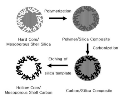 介孔殼層納米澆注法與其他方法最大的不同在于它的模板是一個殼層帶有介孔結構的實心球。在使用之時,將目標粒子引入到模板中,讓粒子填充在模板的殼層結構中,之后去除模板,得到帶有同樣介孔結構的空心球。