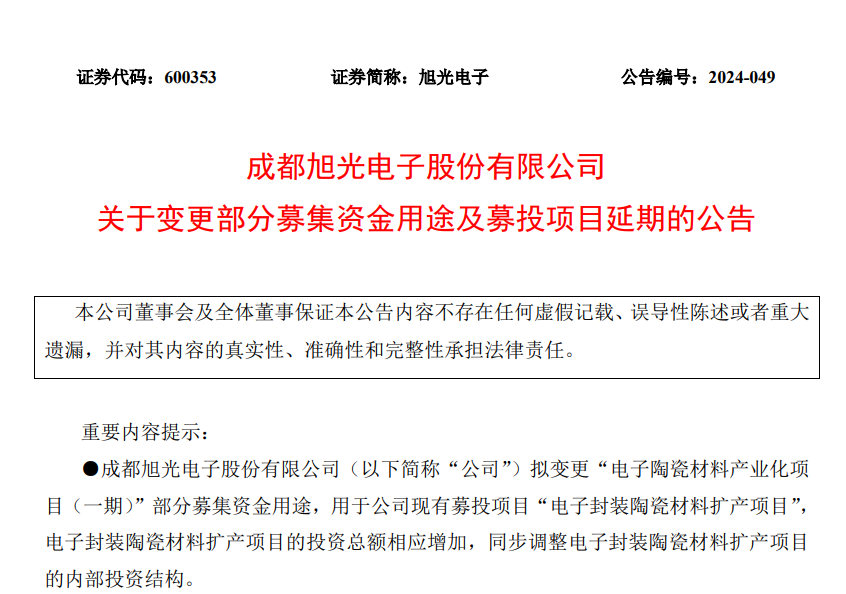 中國粉體網訊 近日,旭光電子發布公告稱,公司擬變更定增募投項目部分資金用途,并宣布將項目建成時間延期一年。變更和延期的項目即是公司三大主業之一的電子材料業務直接關聯的電子封裝陶瓷材料擴產項目和電子陶瓷材料產業化項目(一期)。