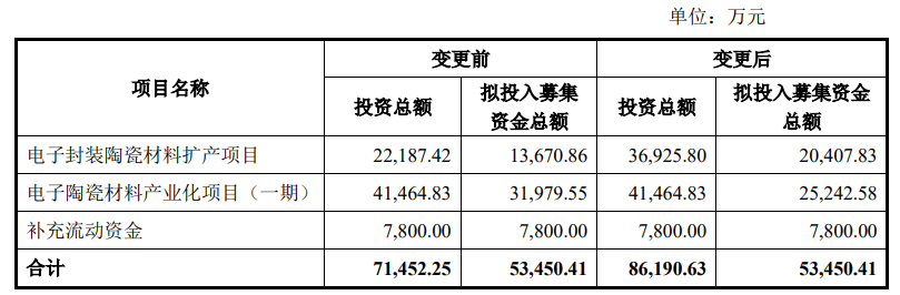 2、氮化硅基板及HTCC涉及的制造工藝復雜,并且生產驗證周期較長,因此為保證募集資金使用效益及保護中小投資者權益,為進一步加強募集資金使用的統籌規劃,經公司結合實際需要謹慎研究決定在保持募投項目實施主體、投資總額不變的情況下,將“電子陶瓷材料產業化項目(一期)”中氮化硅生產線計劃不再使用募集資金投入,未來擬使用自有資金投入,“電子陶瓷材料產業化項目(一期)”減少的募集資金投入調整至“電子封裝陶瓷材料擴產項目”。
