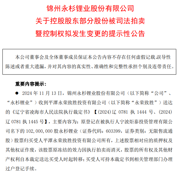 中國(guó)粉體網(wǎng)訊 11月14日,永杉鋰業(yè)發(fā)布公告稱,公司收到平潭永榮致勝投資有限公司(“永榮致勝”)送達(dá)的《遼寧省凌海市人民法院執(zhí)行裁定書(shū)》,法院裁定原登記在被執(zhí)行人寧波炬泰名下的1.02億股永杉鋰業(yè)股票,歸買(mǎi)受人永榮致勝所有。此前于11月1日,永榮致勝通過(guò)司法拍賣(mài)以8.0362億元競(jìng)得了這部分股份。