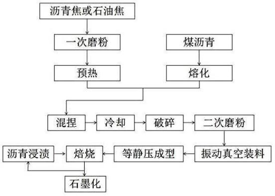 從石墨材料的成型方式來看,主要有擠壓成型、模壓成型、振動成型和等靜壓成型4種,根據成型方式不同可以將石墨材料分為擠壓石墨、模壓石墨、振動石墨和等靜壓石墨。其中,等靜壓成型可制備不同種類的同性結構材料和異形件,且材料的結構分布均勻,具有高密、高強的特點,多用于制造尺寸較大的石墨材料。常見的等靜壓石墨材料制備方法有單相自燒結法和二元法。單相自燒結法就是利用自身具有一定黏結組分的中間相炭微球或生焦為原材料,經等靜壓成型、焙燒和石墨化而制成;二元法則是以瀝青為黏結劑,煅燒焦粉為骨料,經機械混捏、等靜壓成型、焙燒、浸漬和石墨化而制成。