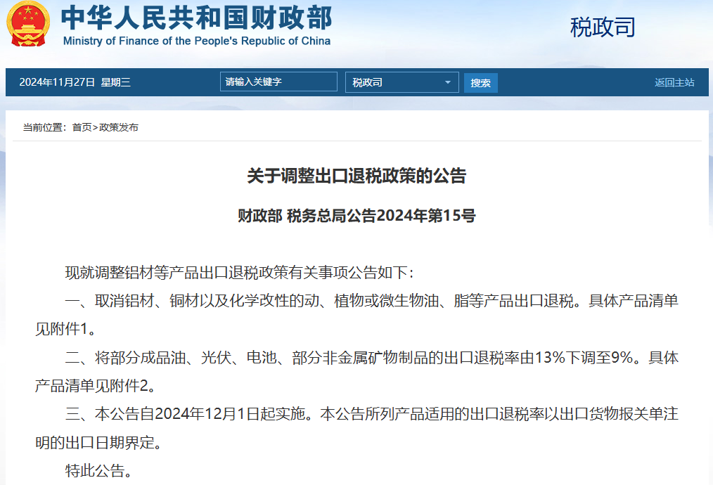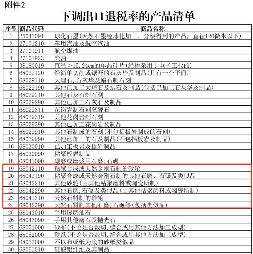 中國粉體網訊 近期,財政部、稅務總局下發2024年第15號公告《關于調整出口退稅政策的公告》。其中,粘聚合成或天然金剛石制的砂輪、粘聚合成或天然金剛石制的其他石磨、石碾及類似品等磨具產品出口退稅率由13%下調至9%,降幅超過三成。該公告自2024年12月1日起實施。