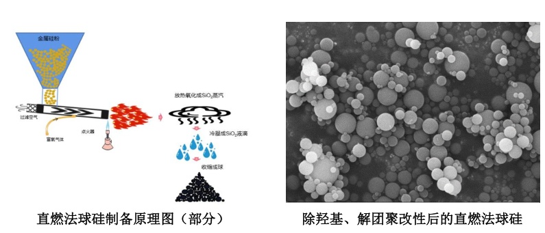 由于火焰熔融球硅屬于天然礦物粉體熔融球化,因此在純度和粒徑分布方面存在一定限制,少數(shù)國外領(lǐng)先企業(yè)采用直燃法(VMC)制備方法,即通過金屬硅粉直接與氧氣反應(yīng),從而制備純度較高、粒度小、粒徑分布相對可控的二氧化硅微球。