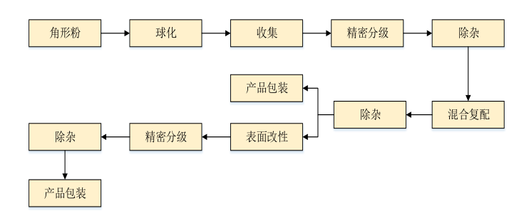 以角形硅微粉為原料,對其進(jìn)行粉碎、篩分、提純等前處理,即將角形硅微粉通過氣流破碎機破碎,經(jīng)過多級預(yù)處理后,篩分到合適粒徑;采用乙炔、天然氣等氣體作為熔融粉體的熱源,其火焰潔凈無污染,將合適粒徑的角形硅微粉采用高溫火焰熔融法將其高溫瞬間熔化,并快速冷卻球化成形,得到高純度且粒徑均勻的球形硅微粉。