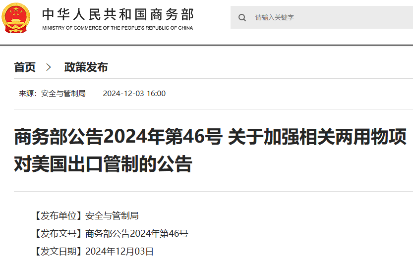 根據《中華人民共和國出口管制法》等法律法規有關規定,決定加強相關兩用物項對美國出口管制。