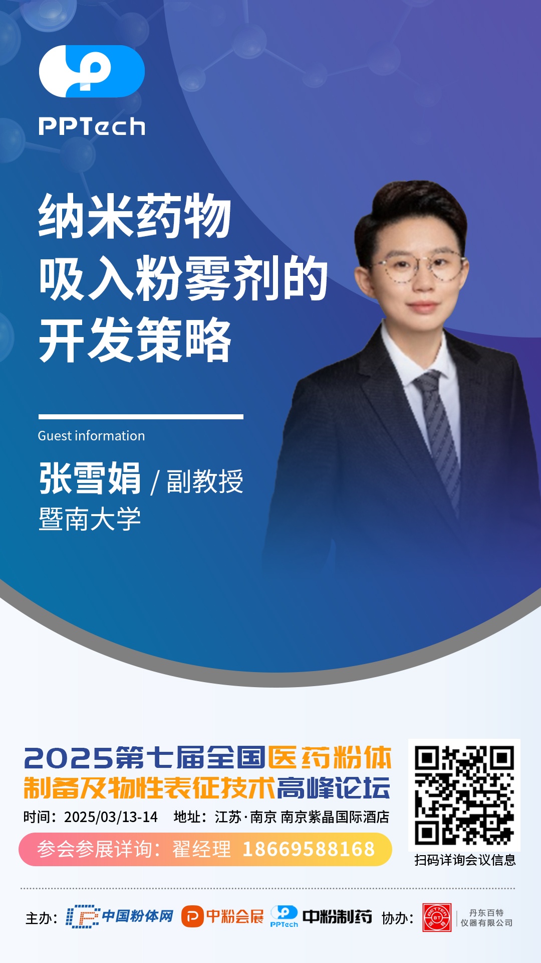 以“從粉體技術,論制藥工藝”為主題,2025年3月13-14日中國粉體網將在江蘇南京紫晶國際酒店舉辦“2025第七屆全國醫藥粉體制備及物性表征技術高峰論壇”。屆時來自暨南大學張雪娟副教授將為大家帶來《納米藥物吸入粉霧劑的開發策略》的主題報告。報告主講人將著重介紹納米藥物吸入粉霧劑開發的多種策略,為納米藥物吸入粉霧劑的定向開發提供理論依據與實踐指導。