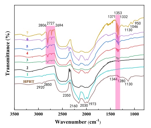 3)紅外光譜表明,HPHT法制備的高氮金剛石中氮原子主要以C心氮為主,A心氮含量較低,而MPCVD法制備的高氮金剛石空位缺陷含量較高,C心氮含量較低,幾乎無A心氮,大部分的氮原子以聚集態的氮片晶和N+形式存在。