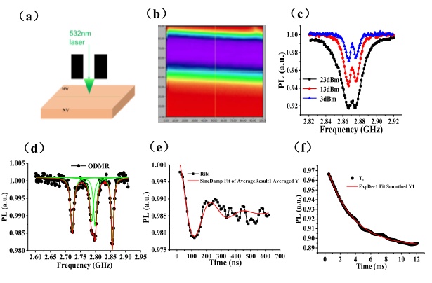 (d)施加偏置磁場后的ODMR曲線;(e)拉比震蕩曲線;(f)縱向弛豫時間