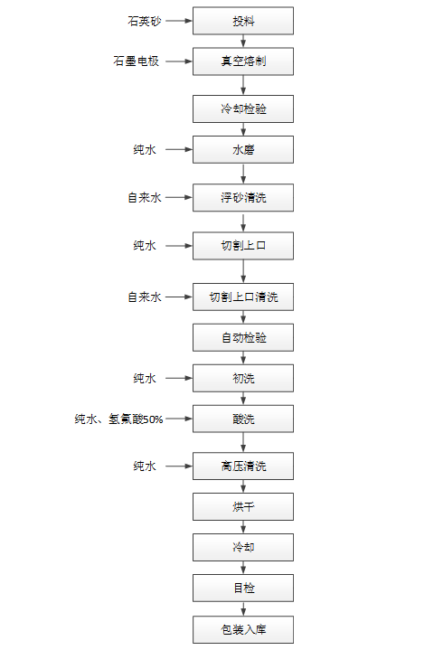 其主要生產(chǎn)工藝流程為:投料-真空熔制-冷卻檢驗(yàn)-水磨-浮砂清洗-切割上口-切割上口清洗-自動(dòng)檢驗(yàn)-初洗-酸洗-高壓清洗-烘干冷卻-目檢-包裝入庫(kù)。