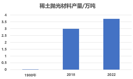 20世紀60年代開始,中國就開始大量生產稀土拋光粉,主要以混合稀土拋光粉、石膏石和純氧化鈰等為原料。到了 20 世紀 70 年代,稀土拋光粉已經代替了常規的氧化鐵,用于玻璃打磨。20世紀90年代,中國稀土拋光粉材料的制備、應用以及生產技術方面都獲得了長足的發展。稀土拋光材料領域出現了從傳統玻璃表面加工到光電子顯示產品的新發展,從傳統應用到光電高科技應用的改進。在產量方面,國內稀土拋光材料的應用從20世紀80年代的不到40噸增加到2018年的3萬噸左右。2022 年,我國稀土拋光材料產量達到 3.73 萬噸,居世界第一。