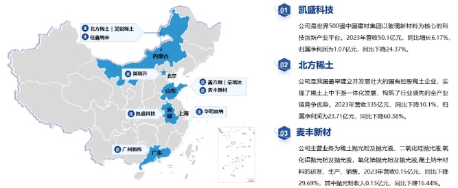 國內稀土拋光粉生產商主要有凱盛科技、北方稀土、麥豐新材、廣州新稀、昊銳稀土、華明高納、鑫方園、佳鑫納米、榮瑞達、國瑞升等。其中凱盛科技是世界500強中國建材集團以玻璃新材料為核心的科技創新產業平臺。北方稀土是我國最早建立并發展壯大的國有控股稀土企業,實現了稀土上中下游一體化發展,構筑了行業領先的全產業鏈競爭優勢。麥豐新材主營業務為稀土拋光粉及拋光液,二氧化硅拋光液,氧化鋁拋光粉及拋光液,氧化鋯拋光粉及拋光液,稀土納米材料的研發、生產、銷售。