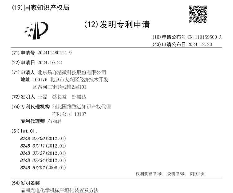 中國粉體網訊 2024年12月20日消息,國家知識產權局信息顯示,北京晶亦精微科技股份有限公司取得一項名為“晶圓光電化學機械平坦化裝置及方法”的專利,助推晶圓拋光。
