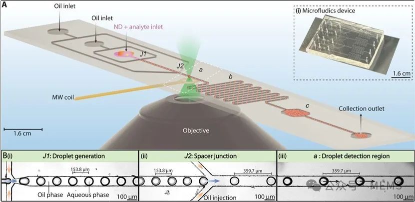 該化學(xué)檢測系統(tǒng)將納米金剛石載入皮升大小(比標(biāo)準(zhǔn)水滴小約十億倍)的液滴中。這些液滴流經(jīng)一個(gè)微流控芯片,并在此受到綠色激光照射和微波場的作用。納米金剛石中的NV色心會發(fā)出紅色熒光,這種熒光會根據(jù)順磁離子等化學(xué)物質(zhì)的存在而變化。這種光學(xué)信號可以通過一種名為光探測磁共振(ODMR)的技術(shù)進(jìn)行檢測和分析。