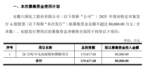 中國粉體網訊 1月7日,六國化工披露公告稱,公司擬向包括公司控股股東銅陵化學工業集團有限公司(以下簡稱“銅化集團”)在內的不超過35名特定投資者發行股票,募集資金總額不超過8億元,扣除發行費用后將全部用于投資28萬噸/年電池級精制磷酸項目。