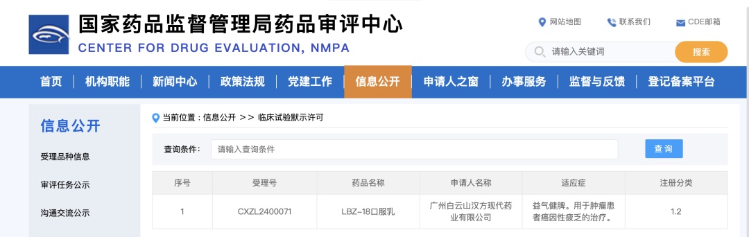 中國粉體網(wǎng)訊 2025年1月8日,據(jù)國家藥品監(jiān)督管理局藥品審評中心官網(wǎng)顯示,白云山漢方自主研發(fā)的 1.2 類中藥創(chuàng)新藥“LBZ-18口服乳”正式獲得藥物臨床試驗批準。這是全球首個“治療腫瘤75癌因性疲乏”1.2類中藥創(chuàng)新藥臨床試驗批件。