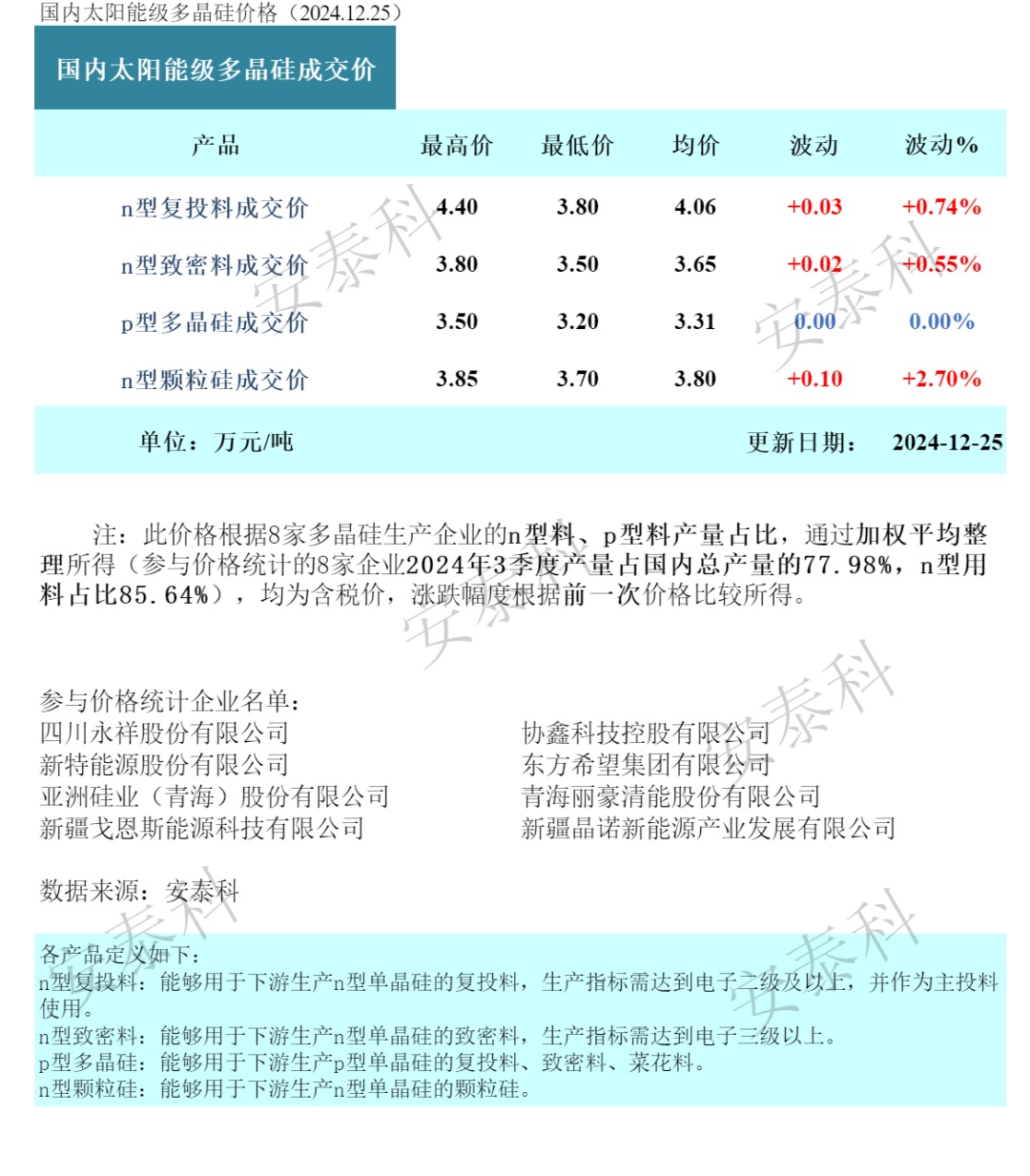 2024年12月25日,中國有色金屬工業協會硅業分會發布的太陽能級多晶硅成交價格顯示,多晶硅價格小幅上漲,N型復投料成交均價4.06萬元/噸;N型顆粒硅成交均價3.8萬元/噸;P型硅料成交均價為3.31萬元/噸。