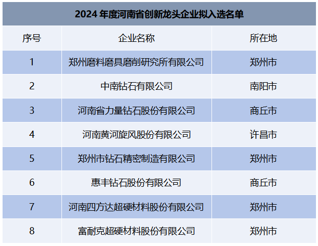 中國粉體網訊 近期,河南省科技廳公示了2024年河南省創新龍頭企業遴選結果,擬入選企業總共166家。其中金剛石行業共8家企業入選,包括中南鉆石、力量鉆石、黃河旋風以及惠豐鉆石等知名龍頭企業。