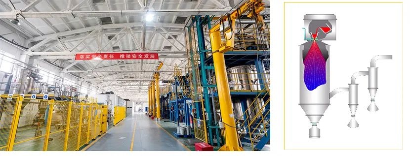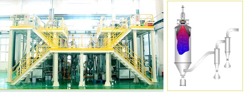 設備由熔煉保溫室、霧化室、旋風除塵器、收粉罐、真空系統、霧化充氣系統、水冷系統、液壓系統、電源及電控系統、工作平臺等組成。設備為立式高架結構,地面布有真空機組和收粉罐。