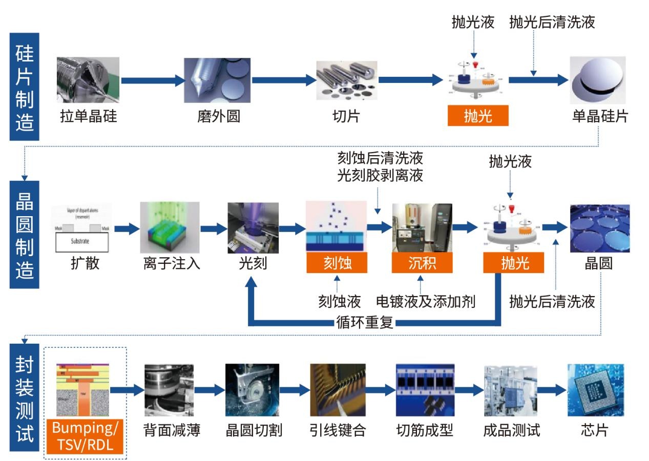 具體來說,目前CMP主要應用于半導體制造過程中對基體材料硅晶片的拋光、淺槽隔離、銅互連、High-k絕緣層金屬柵極(HKMG)先進晶體管制造、鰭式場效應晶體管(FinFET)、局部連接的高級觸點、高級邏輯器件中的高遷移率溝道材料、高級動態隨機存儲器中的埋入式字線晶體管結構等,對于不同的多層材料的表面平坦化均有良好的效果。