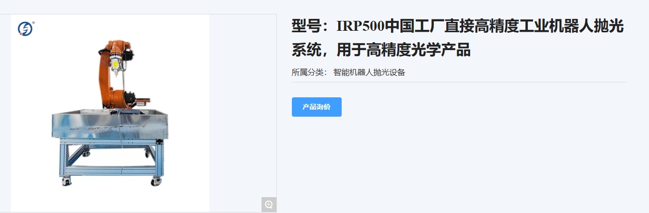 至臻光學入選“首臺套”的另一產品——機器人拋光機,采用高精度穩定可靠的工業機器人作為運動平臺,掛載高精度力控拋光頭,配合數控光學加工工藝軟件,可以實現大口徑平面、球面、非球面、離軸非球面和自由曲面等光學元件的確定性拋光加工。