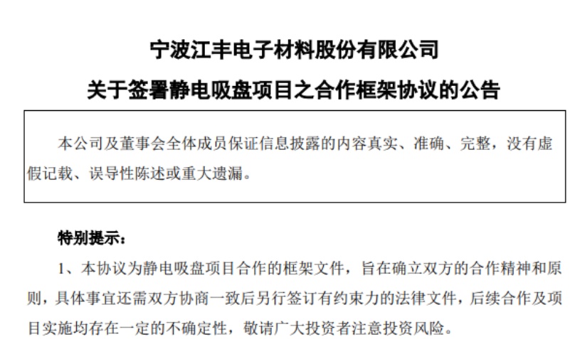 近日,寧波江豐電子材料股份有限公司發布公告稱,公司于2025年1月17日與KSTEINC.(簡稱:KSTE)簽署了《關于靜電吸盤項目之合作框架協議》,公司擬向KSTE引進靜電吸盤生產技術及采購靜電吸盤生產線。