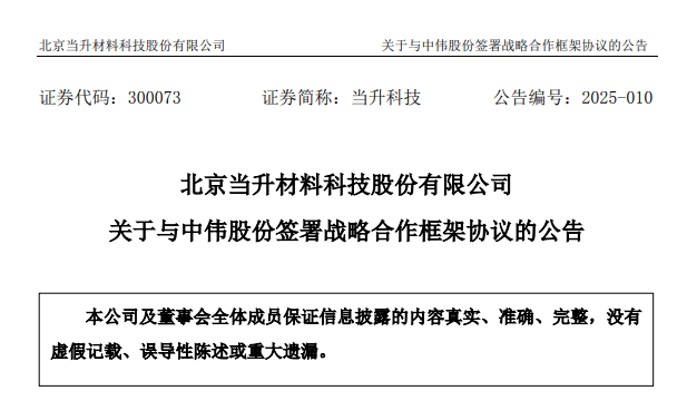 當升科技與中偉股份一致同意就動力、儲能、低空及AI、機器人等領域鋰電池用三元材料、鈷酸鋰、磷酸(錳)鐵鋰、鈉電材料、固態鋰電材料、半固態鋰電材料、富鋰錳基等產品的原材料供應鏈建立長期合作伙伴關系。