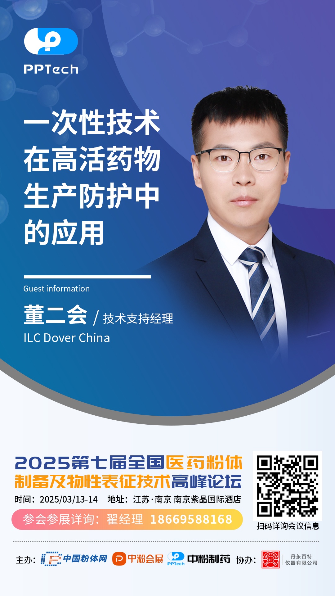 以“從粉體技術(shù),論制藥工藝”為主題,2025年3月13-14日中國粉體網(wǎng)將在江蘇南京紫晶國際酒店舉辦“2025第七屆全國醫(yī)藥粉體制備及物性表征技術(shù)高峰論壇”。屆時(shí)來自ILC Dover的技術(shù)支持經(jīng)理董二會為大家?guī)怼?strong>一次性技術(shù)在高活藥物生產(chǎn)防護(hù)中的應(yīng)用》的主題報(bào)告。報(bào)告主講人基于公司在活性粉體防護(hù)方面成功的應(yīng)用案例和豐富的經(jīng)驗(yàn),為大家介紹制藥工藝中的一次性技術(shù),同時(shí)展示公司產(chǎn)品包括專為固體粉末使用的柔性膜材、一次性轉(zhuǎn)運(yùn)袋、連續(xù)襯里、柔性隔離器、以及個(gè)人防護(hù)系統(tǒng)等。