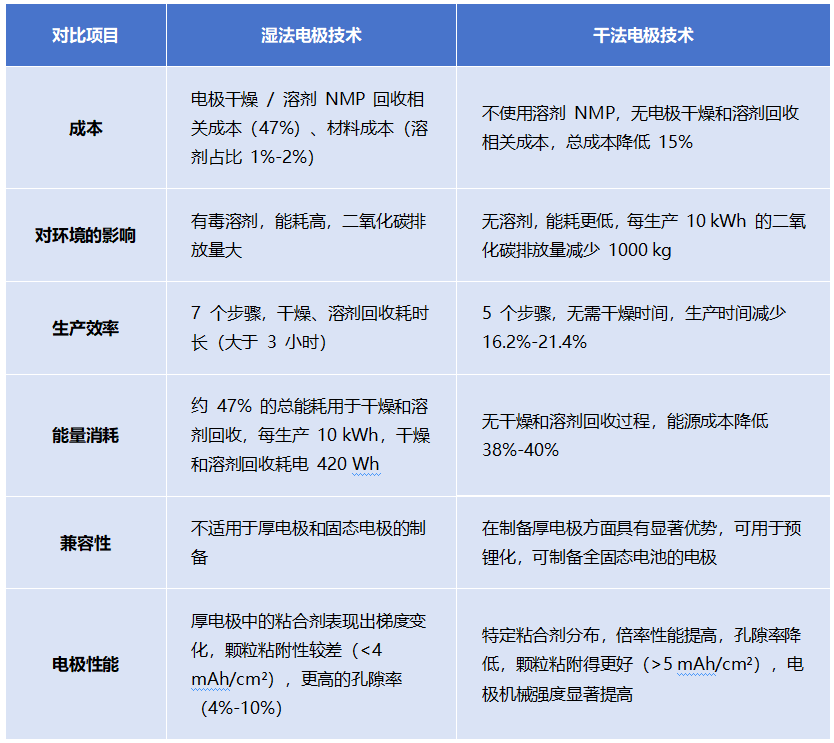 干法電極技術(shù)源于“干膜技術(shù)”,干膜技術(shù)起源于制藥、合金制備和瓷器等行業(yè),經(jīng)過后續(xù)的工藝改進(jìn)和技術(shù)突破,該技術(shù)被逐漸應(yīng)用到儲(chǔ)能領(lǐng)域。與傳統(tǒng)濕法電極技術(shù)相比,干法電極技術(shù)表現(xiàn)出獨(dú)特的優(yōu)勢,主要表現(xiàn)在節(jié)省成本、降低能耗和提高電極質(zhì)量。干法電極制備方法主要有粉末噴涂法、黏結(jié)劑纖維化成膜法和干壓法等。