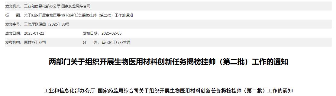 中國(guó)粉體網(wǎng)訊 2月5日,工業(yè)和信息化部辦公廳和國(guó)家藥監(jiān)局綜合司發(fā)布“關(guān)于組織開(kāi)展生物醫(yī)用材料創(chuàng)新任務(wù)揭榜掛帥(第二批)工作的通知”。