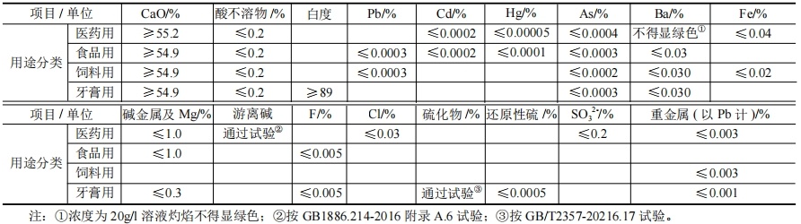 對(duì)涉及日常生活常用的食品添加劑、飼料碳酸鈣、醫(yī)藥級(jí)碳酸鈣、牙膏專用碳酸鈣對(duì)產(chǎn)品質(zhì)量要求較高,特別是對(duì)有害重金屬元素(Pb、Cr6+、As、Hg、Cd、Ba等)有嚴(yán)格要求,是名副其實(shí)的高端高值化鈣項(xiàng)目。