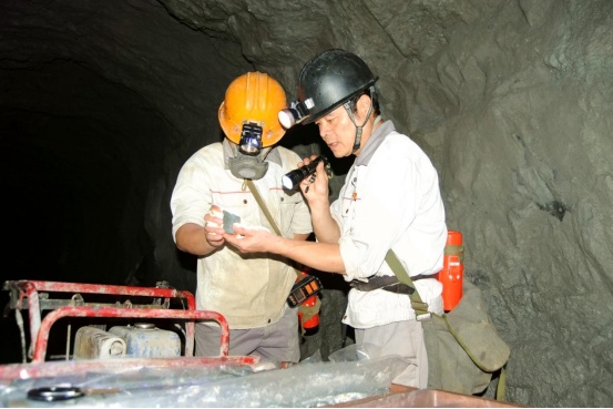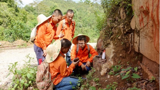 圖為地質(zhì)技術(shù)員在查看礦體露頭