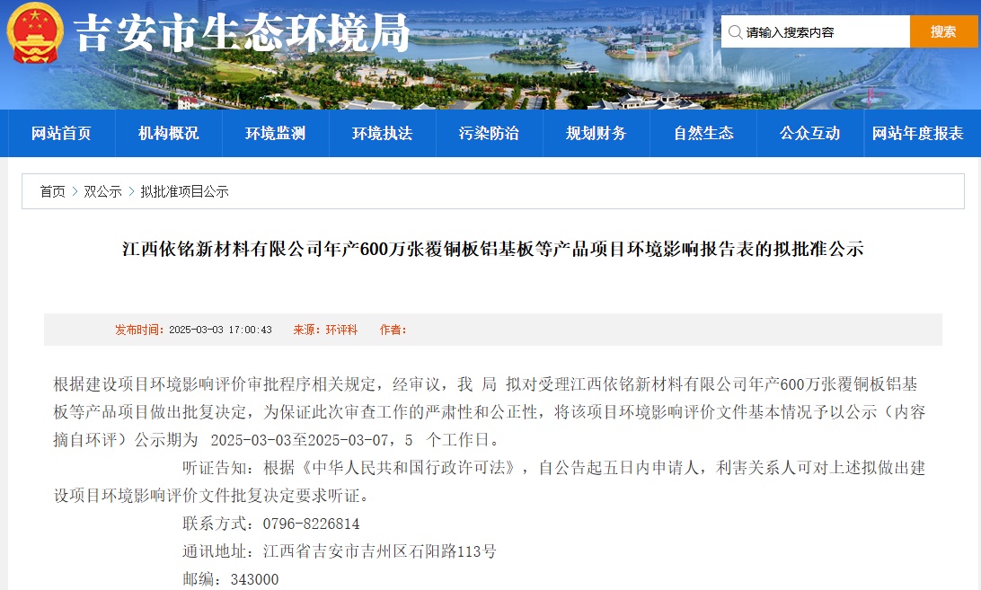 吉安市生態(tài)環(huán)境局,江西依銘新材料有限公司項目環(huán)評公示公告,長江有色金屬網(wǎng),財聯(lián)社以及網(wǎng)絡公開信息等