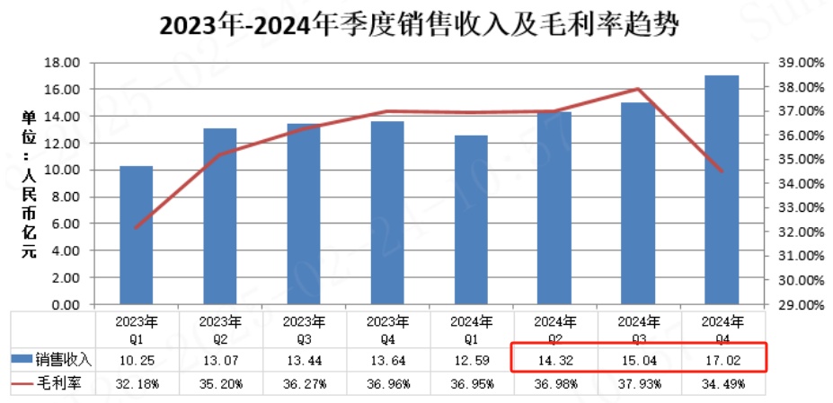 需要強調的是,2024年公司全年銷售收入創歷史新高,第二、三、四季度營收連續創造順絡電子單季度歷史新高,其中第四季度單季度營收實現人民幣17.02億元,首次實現單季度營收突破人民幣17億大關。